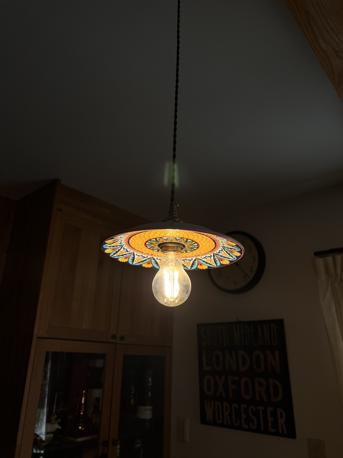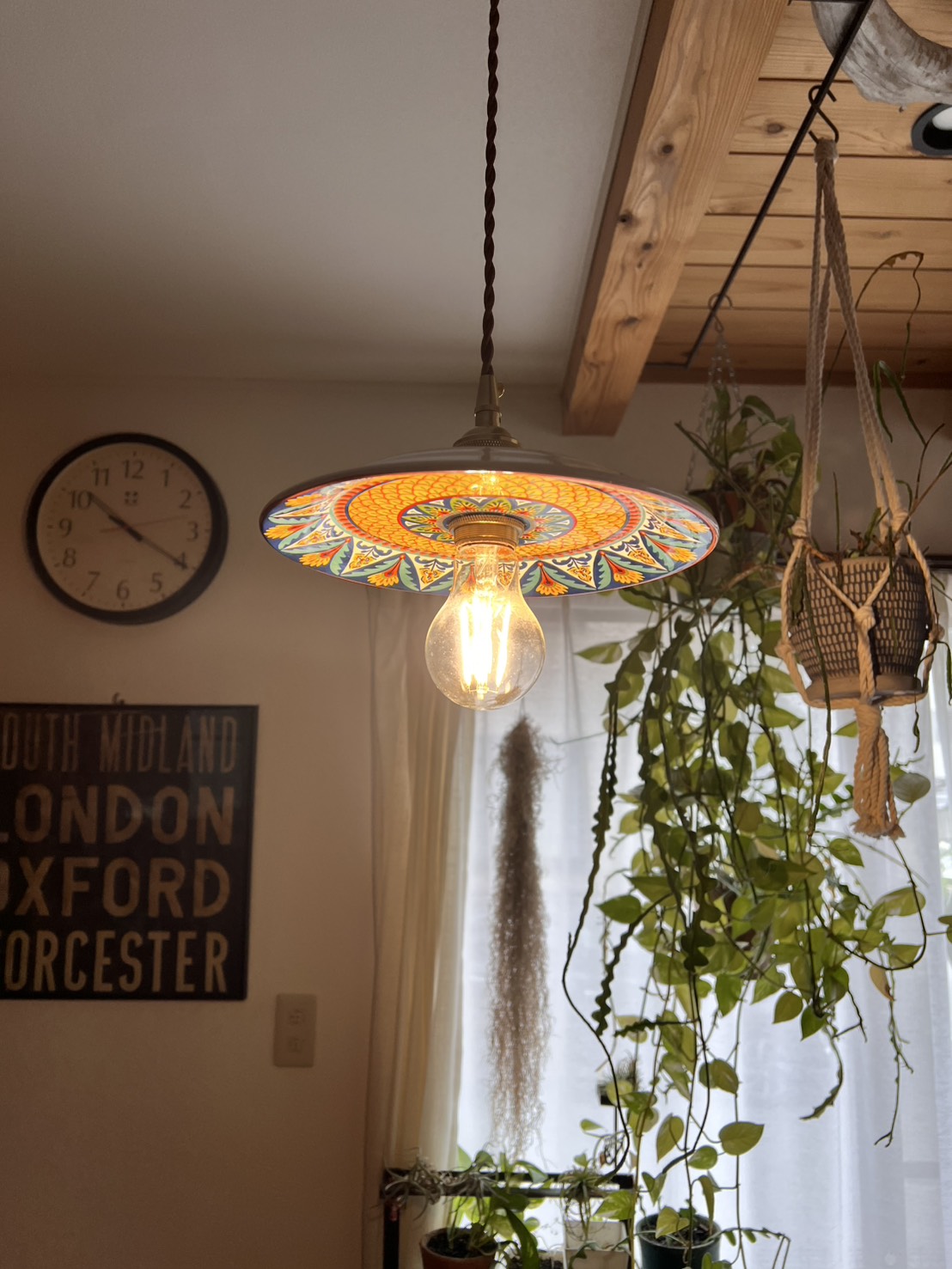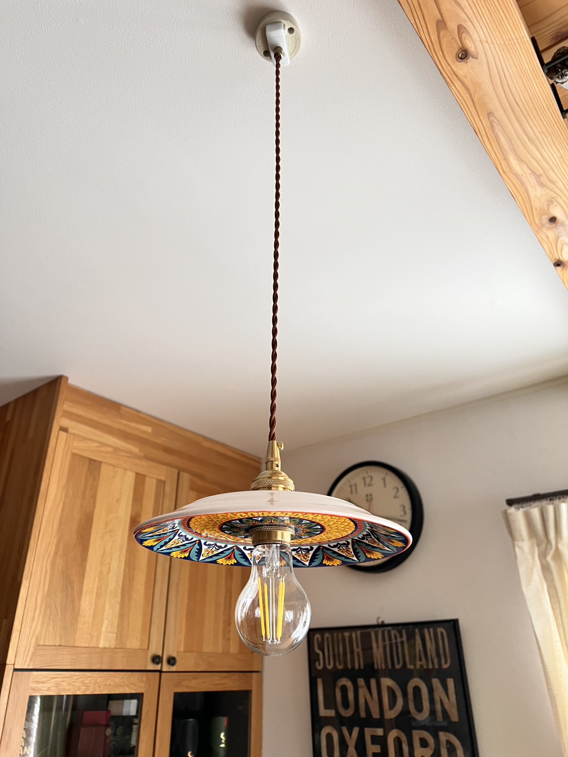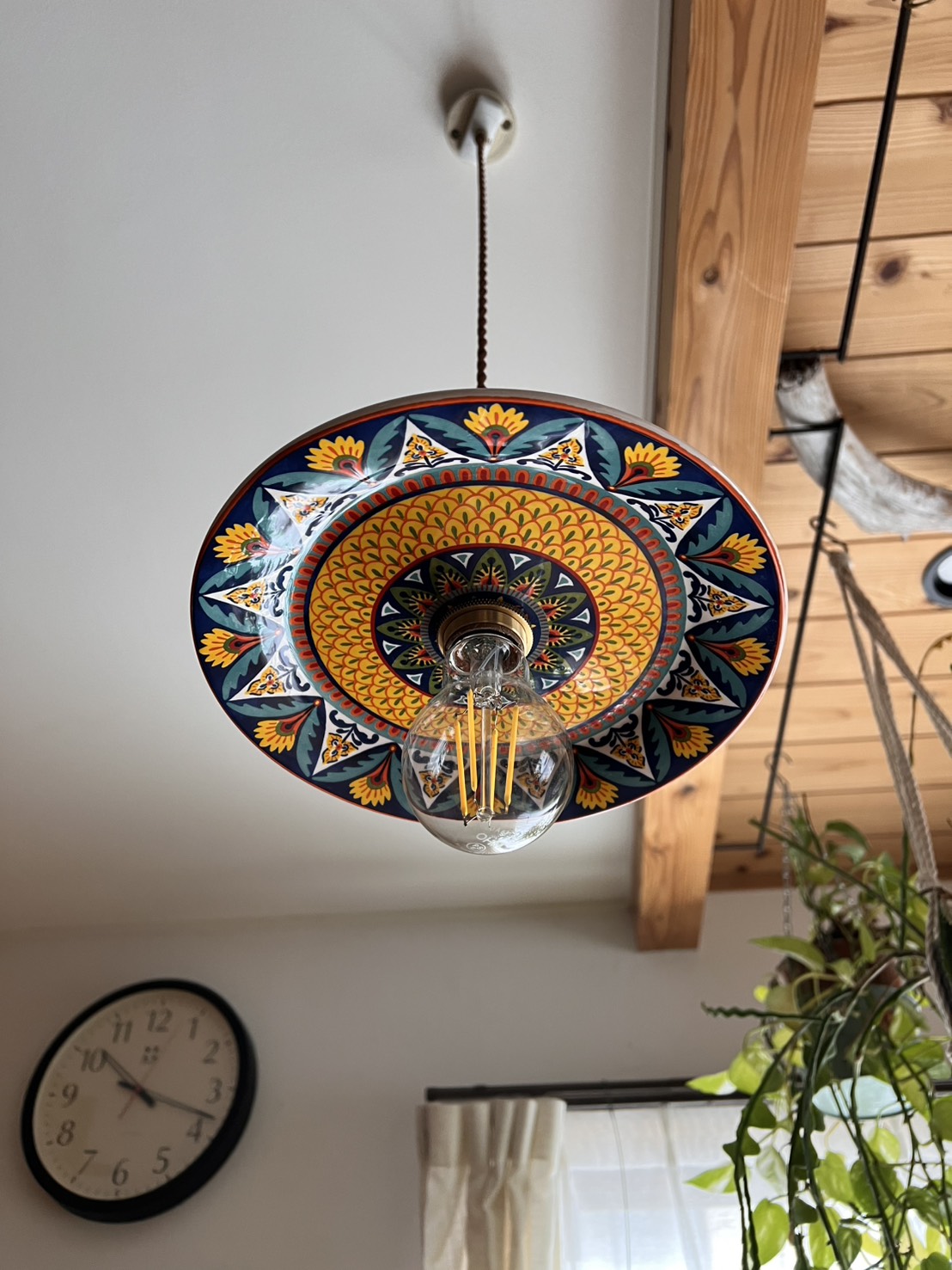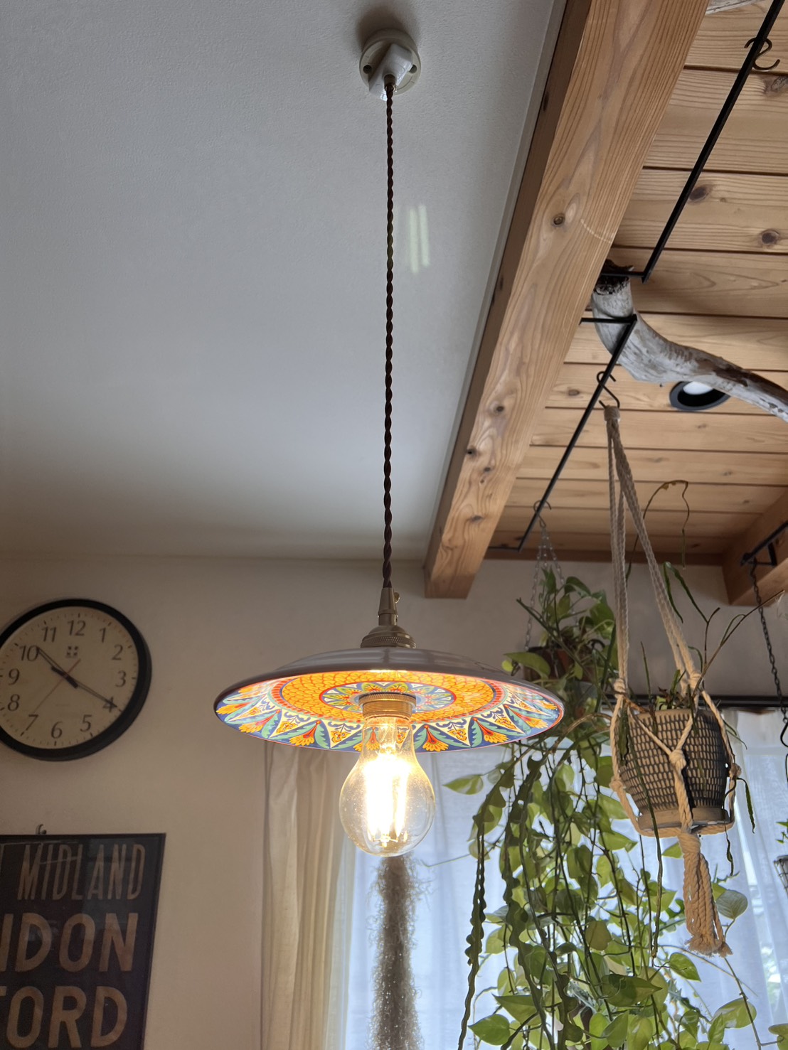 スペイン製の彩陶シェードと日本の職人仕上げが融合した一点物のペンダントライト。直径22cmのコンパクトなフォルムはダイニングや玄関、トイレなど小〜中空間に最適。真鍮ソケットと布コードで高級感と経年変化を楽しめ、LED使用で模様が透けて浮かび上がる夜の演出が圧巻です。軽量で取り付けやすく、空間に個性と温かさを与えます。
