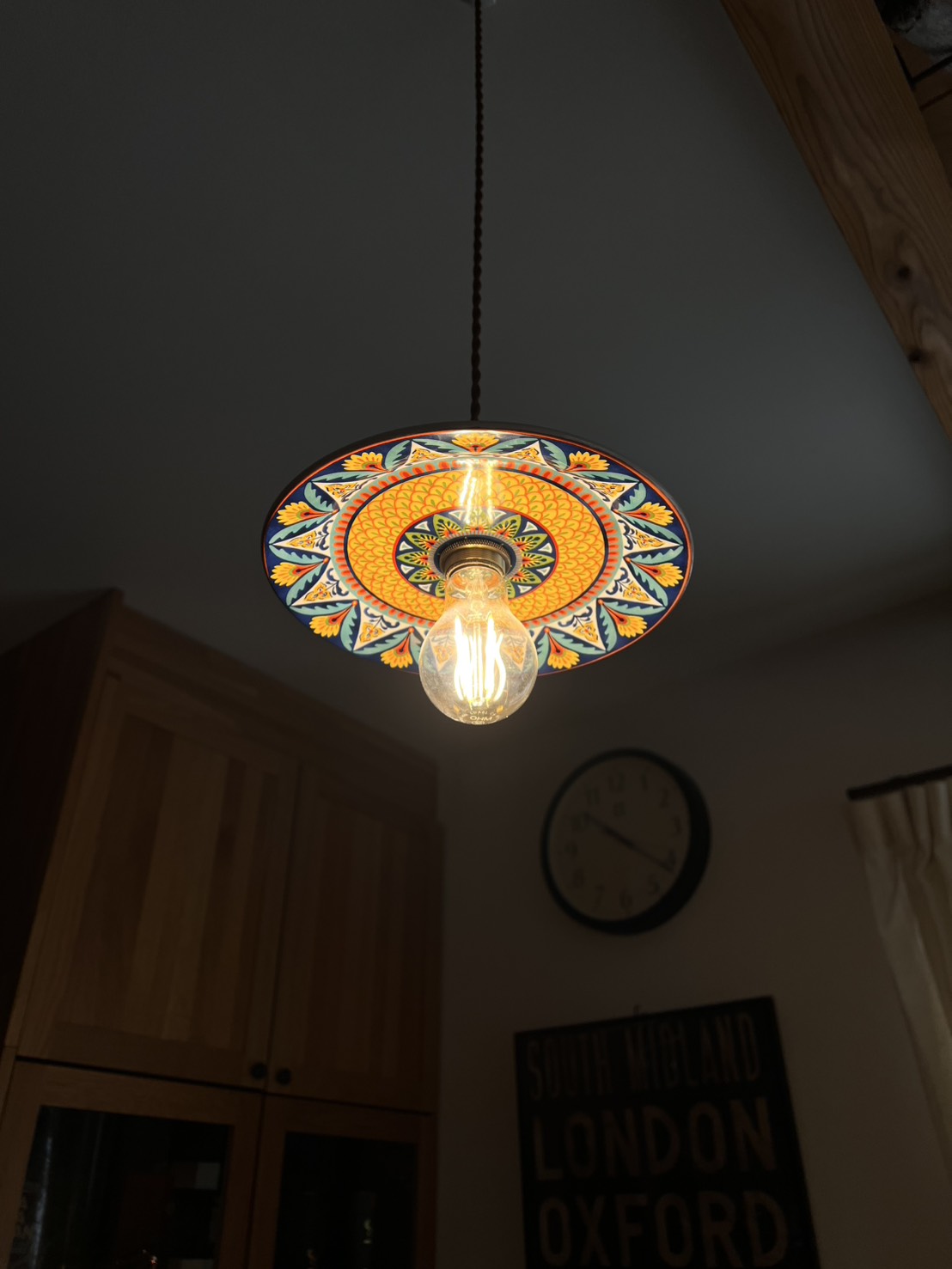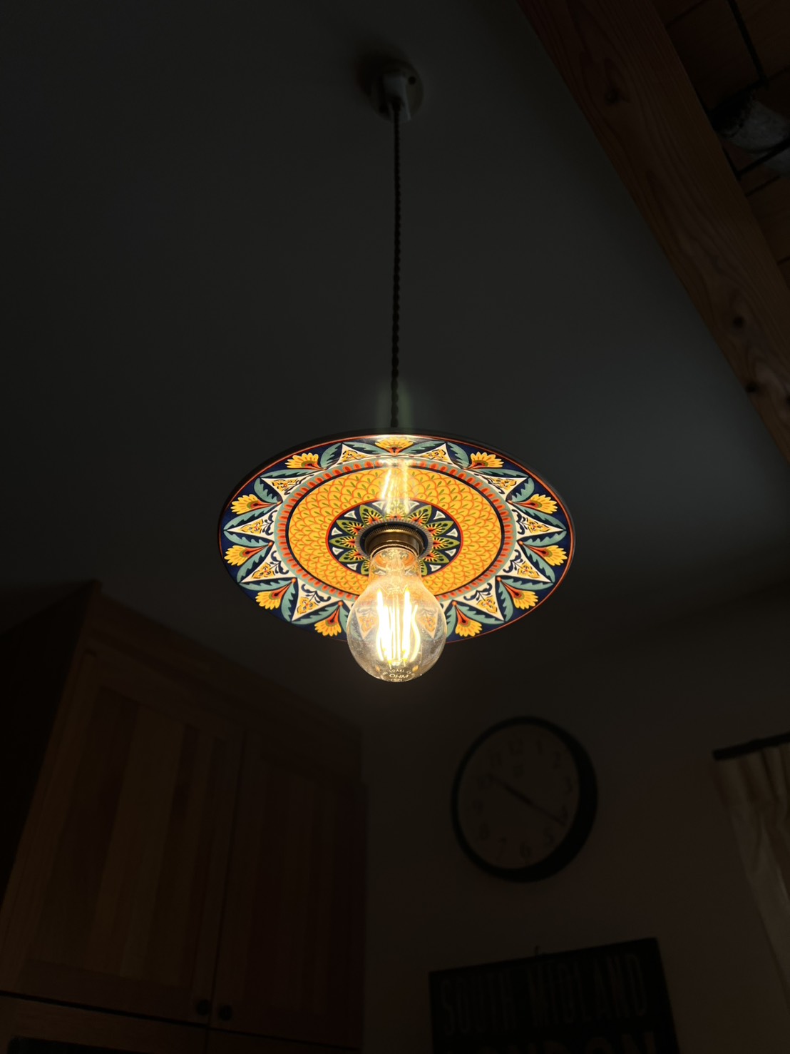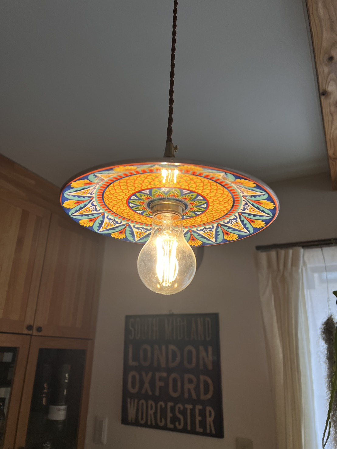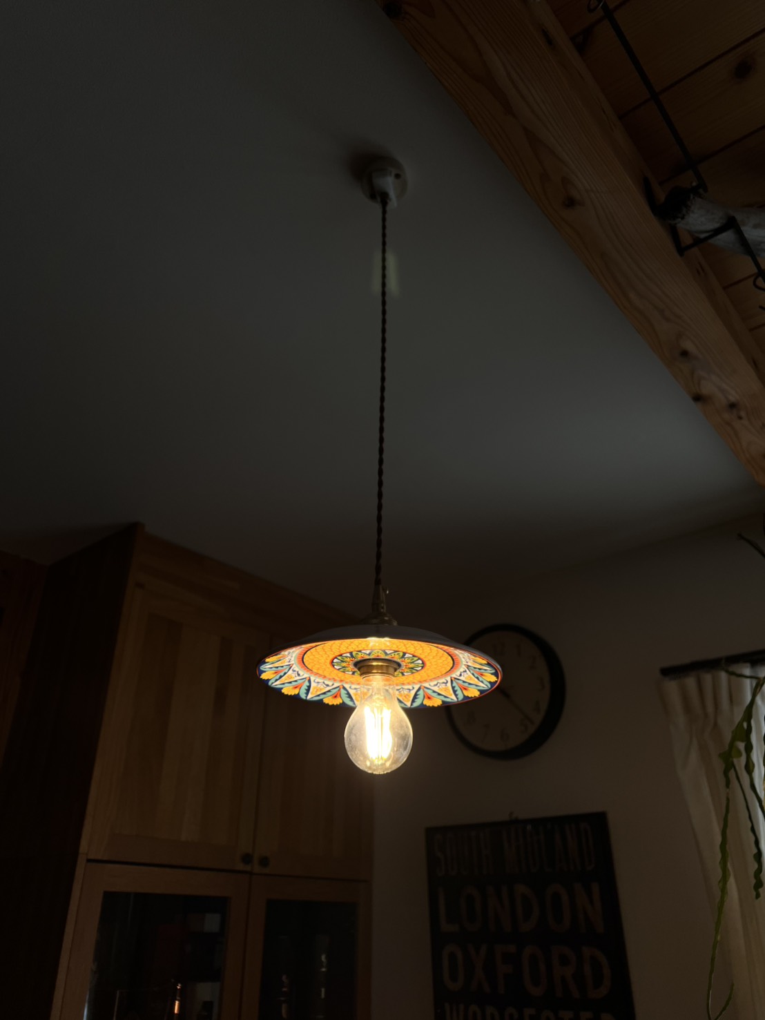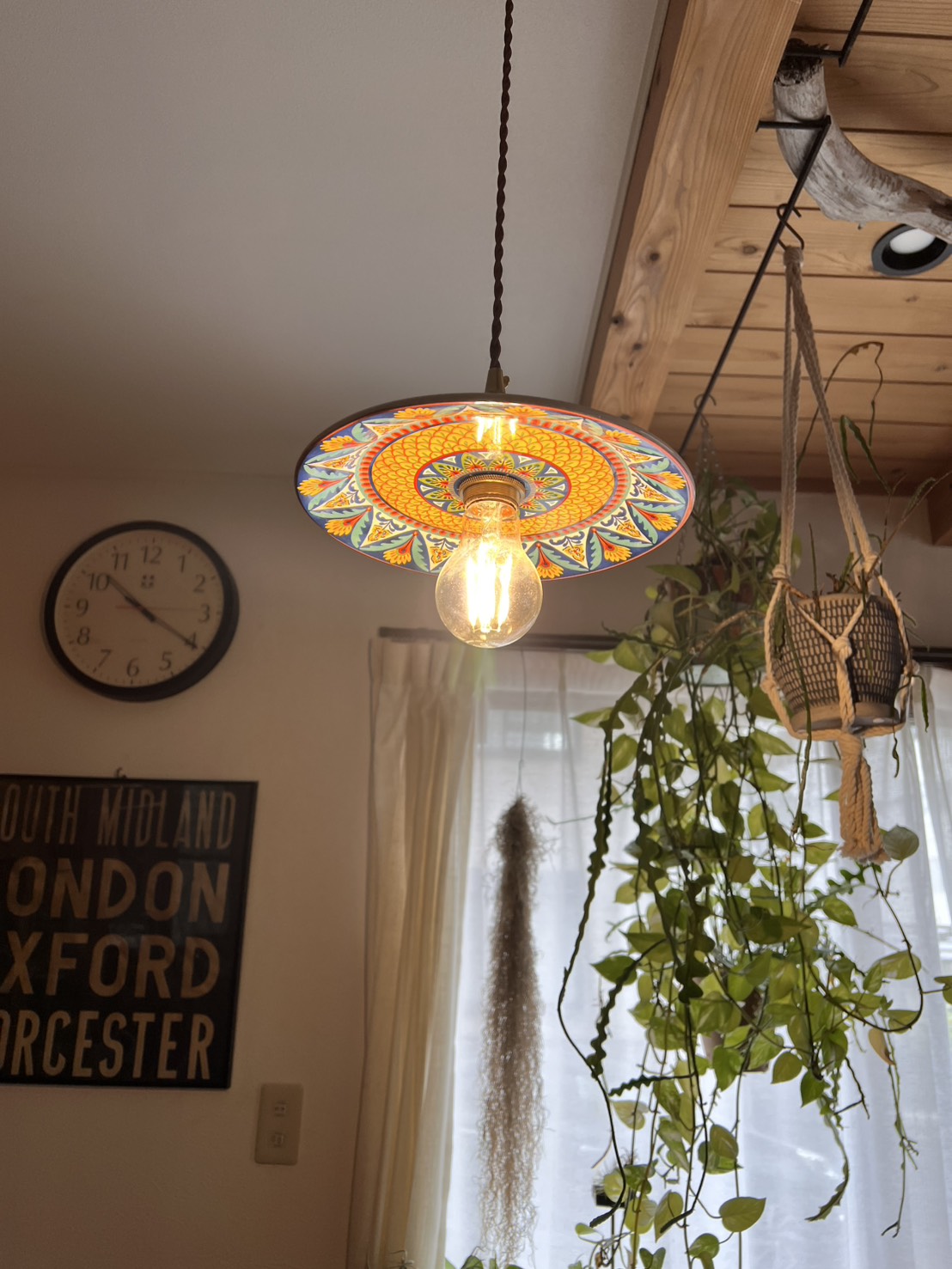 スペイン製の彩陶シェードと日本の職人仕上げが融合した一点物のペンダントライト。直径22cmのコンパクトなフォルムはダイニングや玄関、トイレなど小〜中空間に最適。真鍮ソケットと布コードで高級感と経年変化を楽しめ、LED使用で模様が透けて浮かび上がる夜の演出が圧巻です。軽量で取り付けやすく、空間に個性と温かさを与えます。
