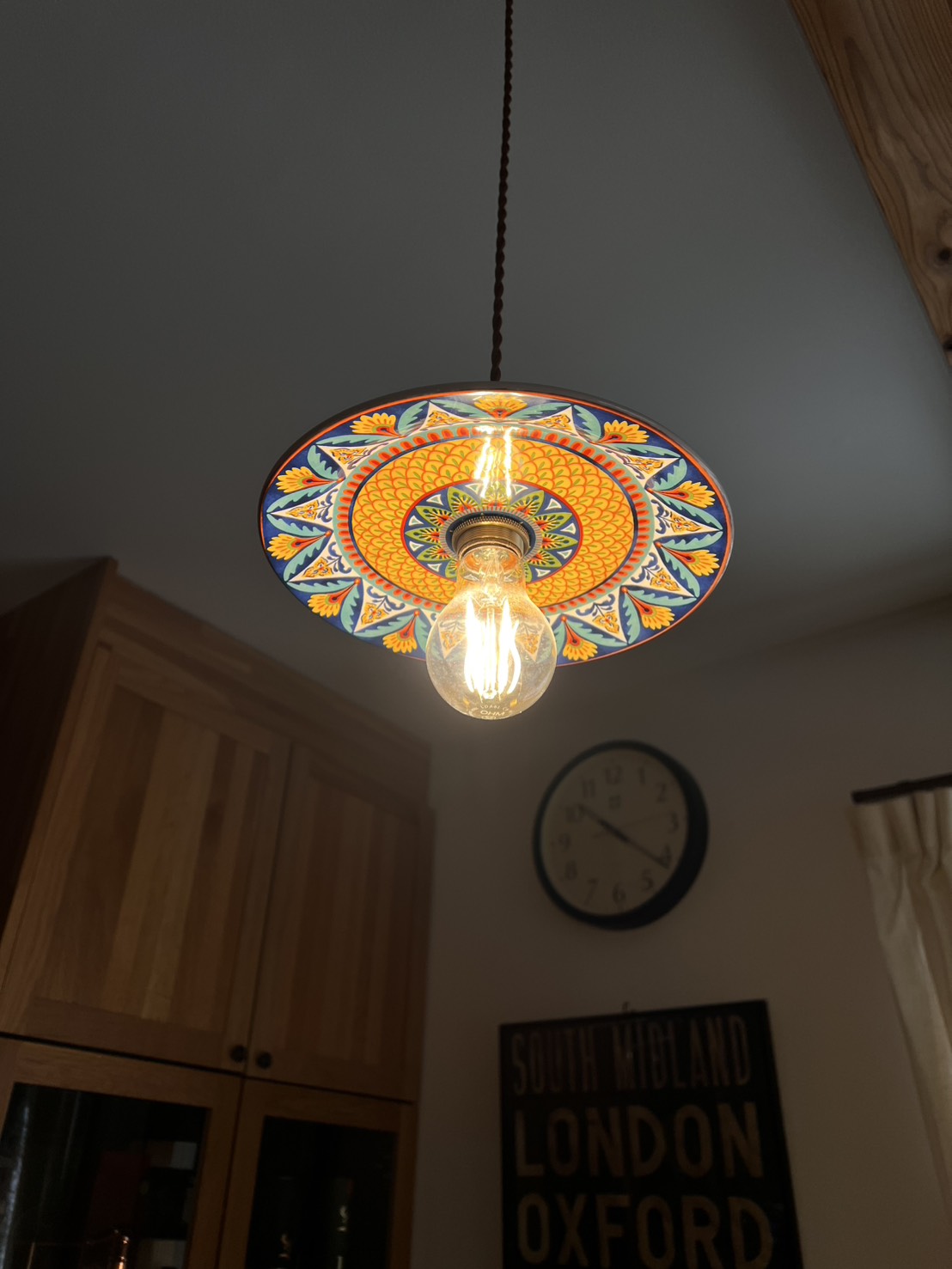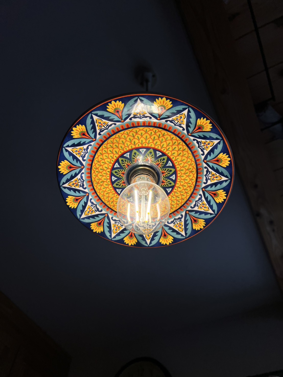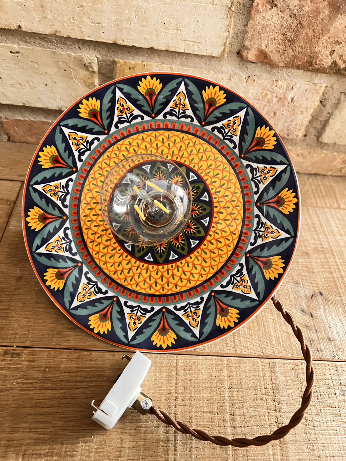 スペイン製タラベラ陶器の鮮烈な色彩と日本の職人仕上げが融合した一灯。直径20cmのコンパクトな陶器シェードは、下から見上げると強烈な赤と水色・黄・橙の花模様が透けて浮かび上がり、テーブルや壁に絵画のような陰影を描く。真鍮ソケットと布コードで高級感と経年美を楽しめ、日常を劇的に変えるムード照明として最適です。