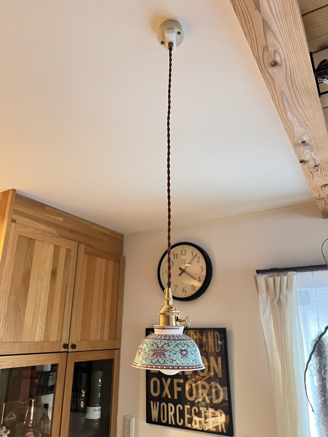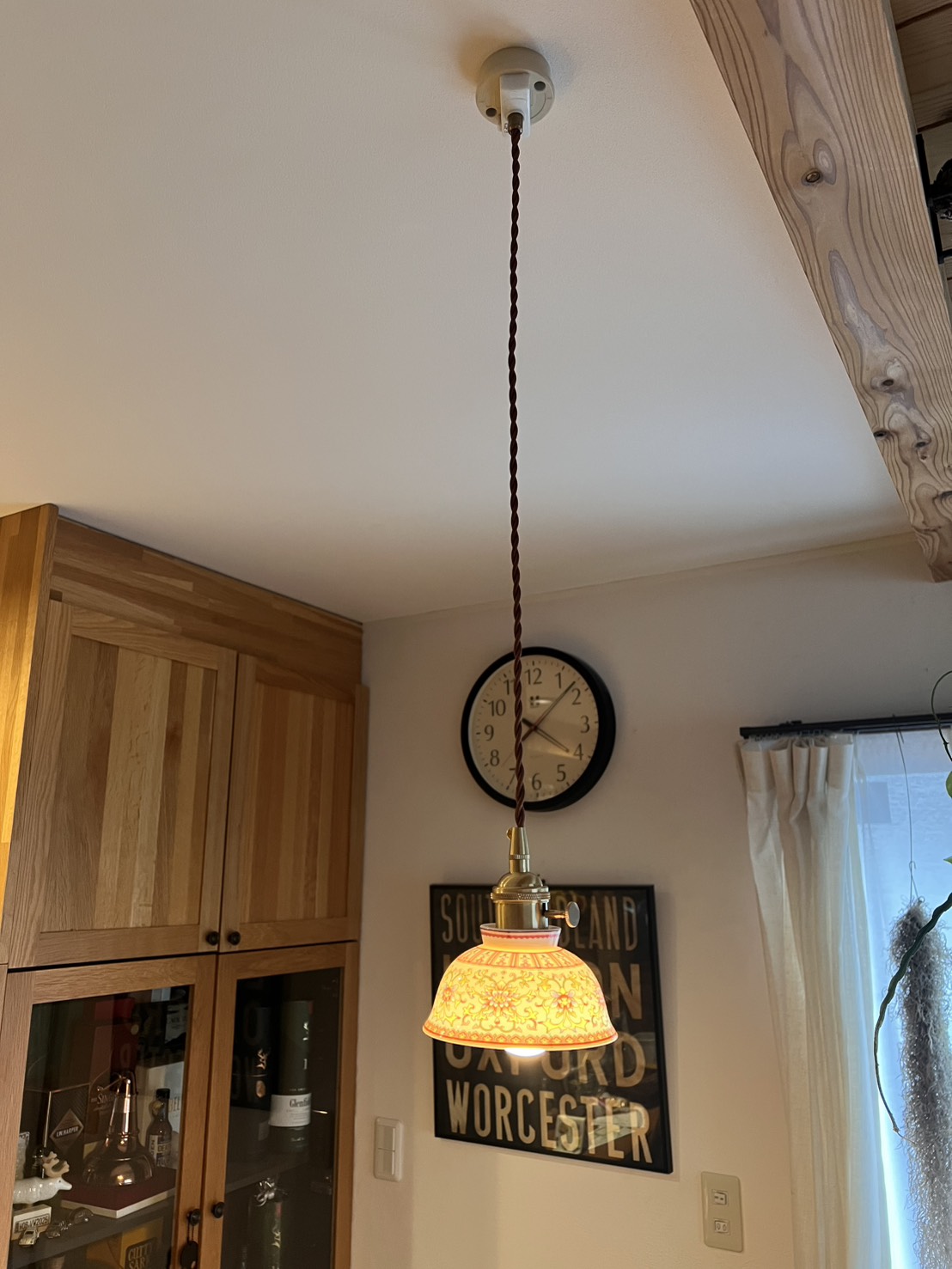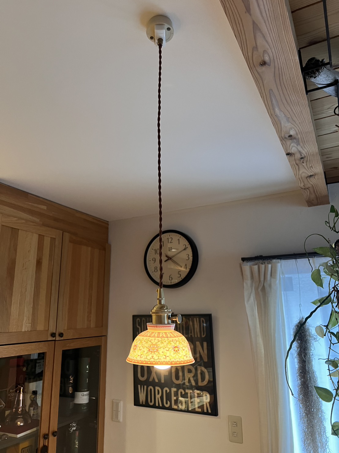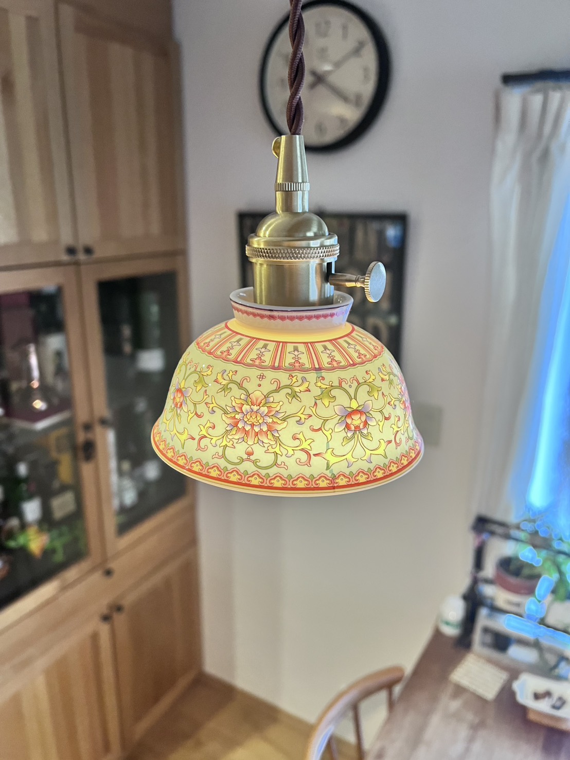 スペイン製の彩陶シェードと日本の職人仕上げが融合した一点物のペンダントライト。直径22cmのコンパクトなフォルムはダイニングや玄関、トイレなど小〜中空間に最適。真鍮ソケットと布コードで高級感と経年変化を楽しめ、LED使用で模様が透けて浮かび上がる夜の演出が圧巻です。軽量で取り付けやすく、空間に個性と温かさを与えます。