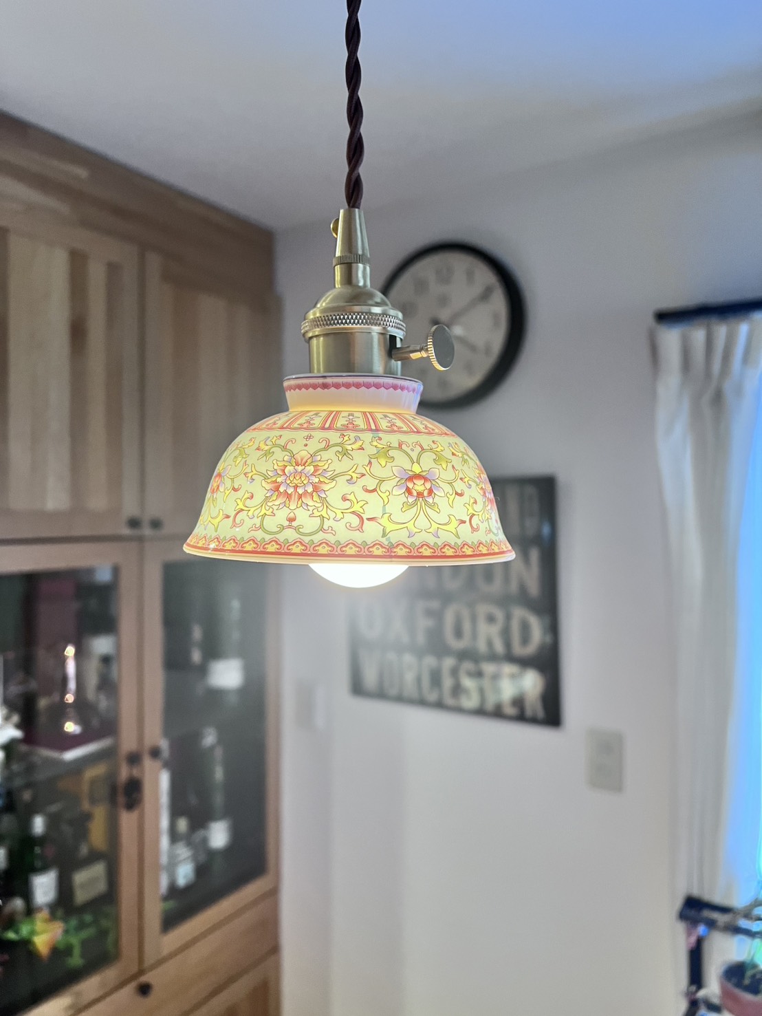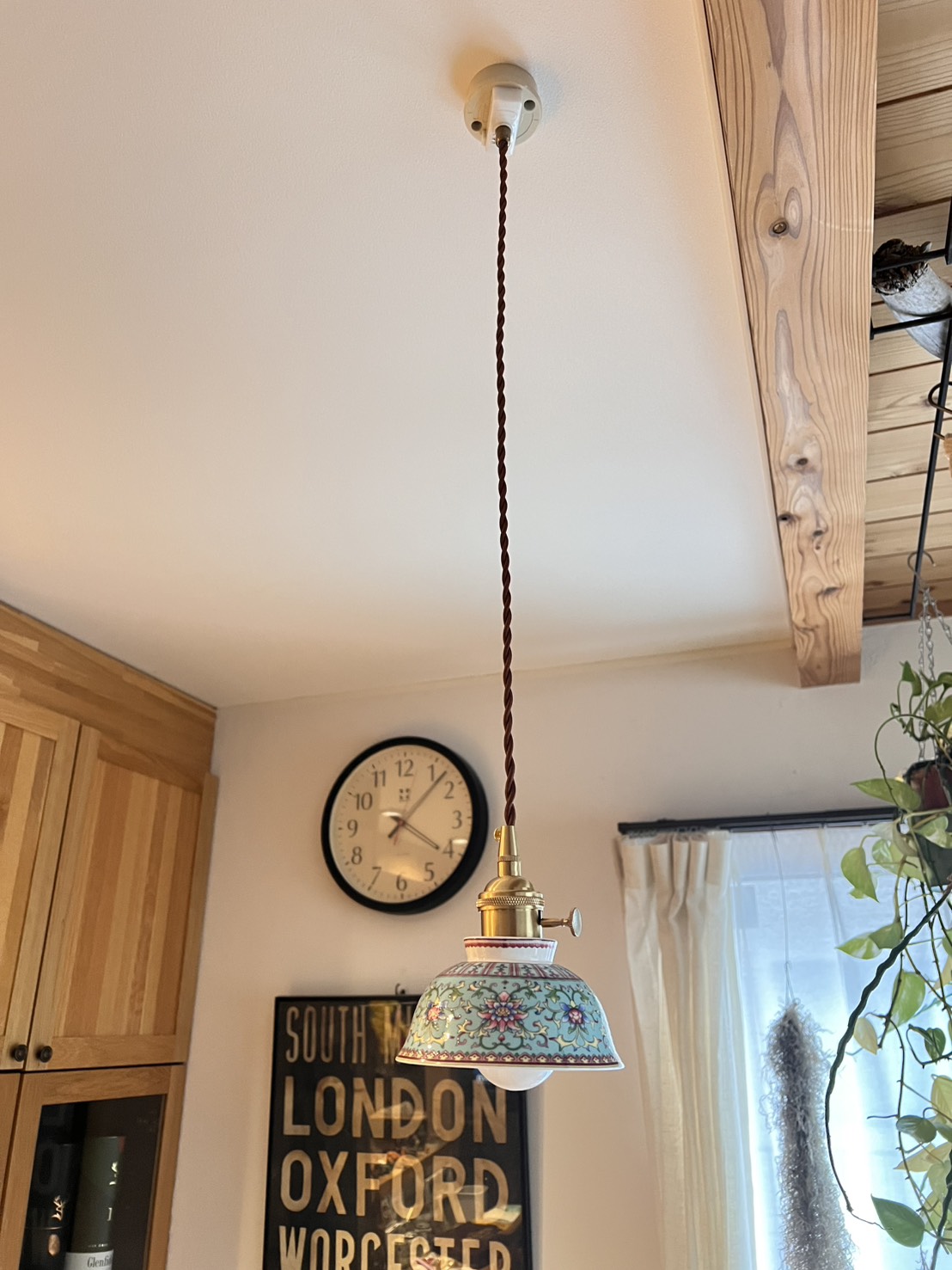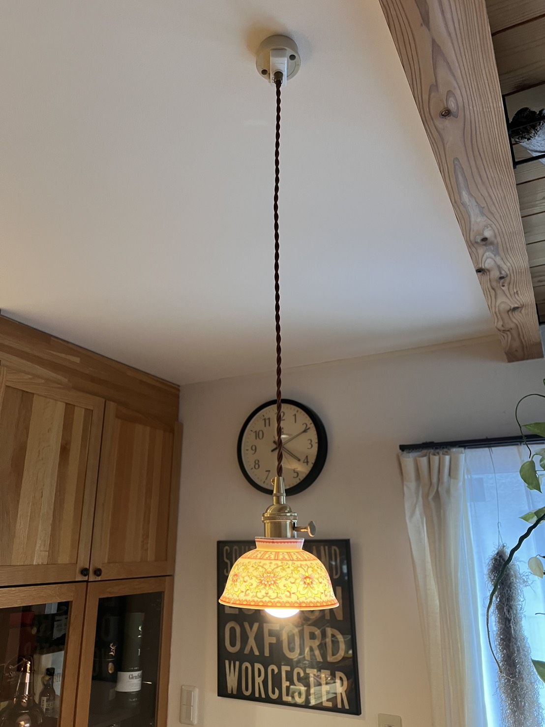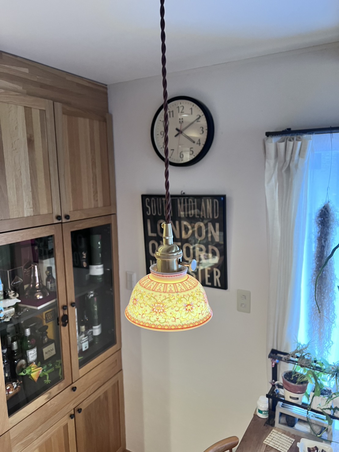 スペイン製の彩陶シェードと日本の職人仕上げが融合した一点物のペンダントライト。直径22cmのコンパクトなフォルムはダイニングや玄関、トイレなど小〜中空間に最適。真鍮ソケットと布コードで高級感と経年変化を楽しめ、LED使用で模様が透けて浮かび上がる夜の演出が圧巻です。軽量で取り付けやすく、空間に個性と温かさを与えます。