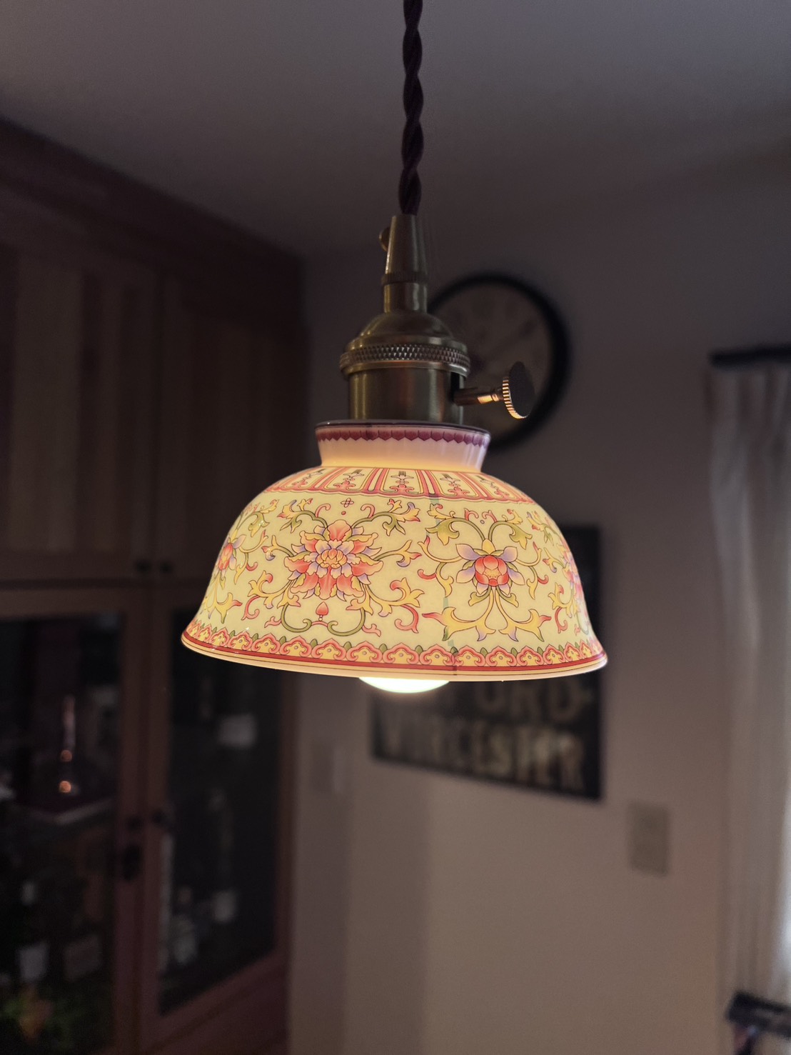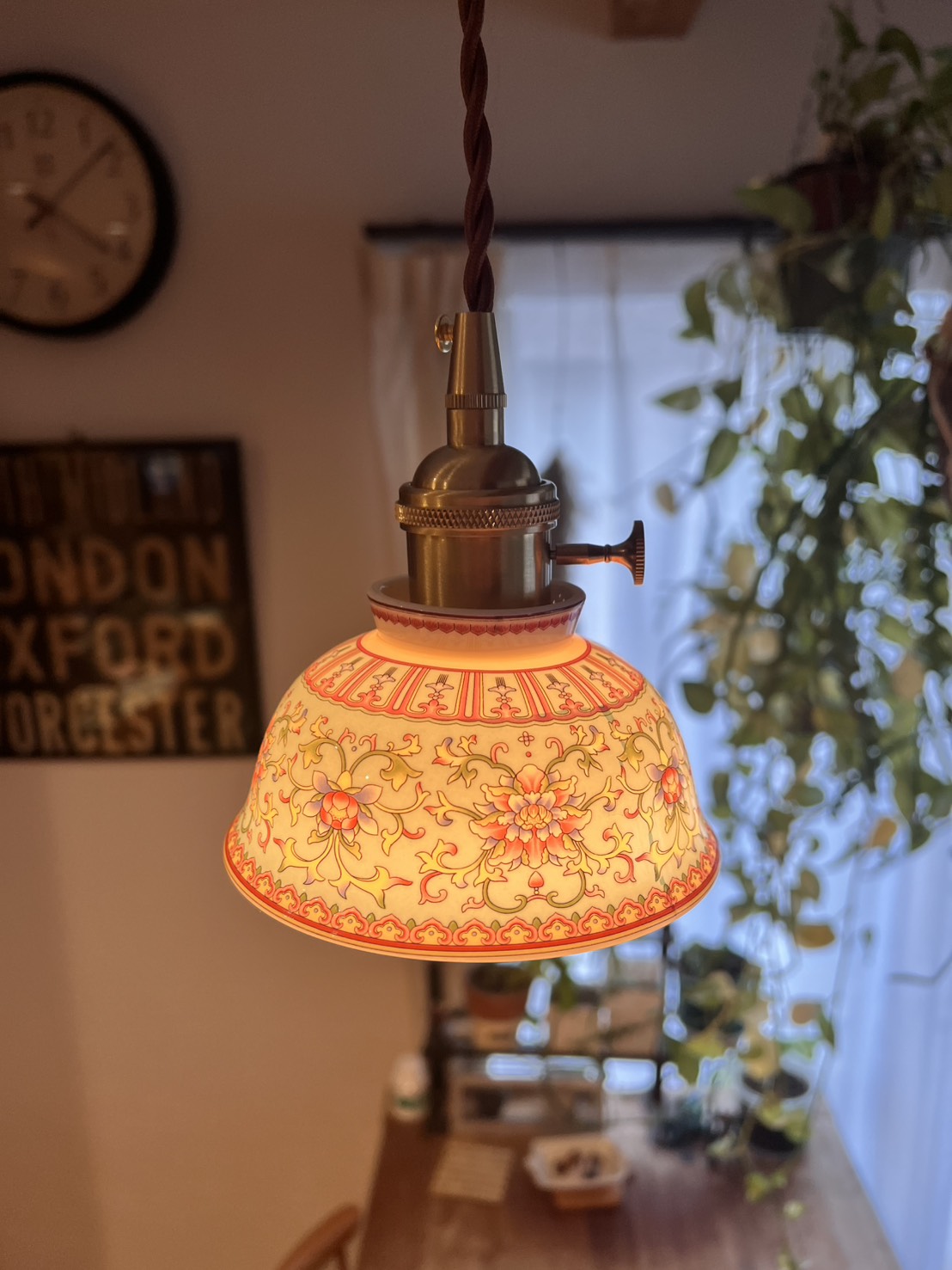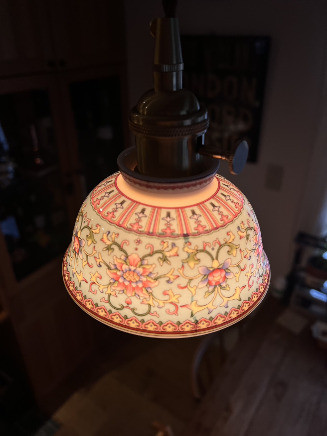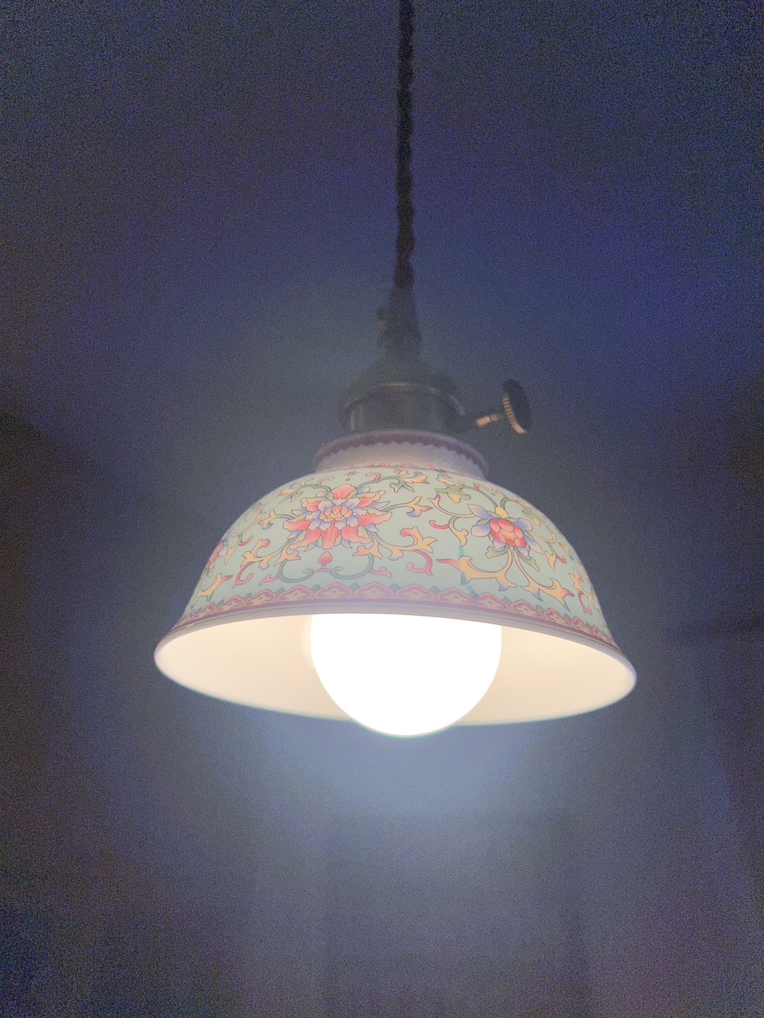 灯りをともすとシェード全体がまるで自ら発光しているかのように輝きます。赤や黄、ピンクの花模様が柔らかく浮かび上がり、陶器を透過した光が空間に温かく広がるその姿は、ガラス照明にはない奥行きと艶やかさを放ちます。千年の歴史を誇る景徳鎮の陶工が生み出した器に、日本の職人技が加わり完成したこの照明は、日常を芸術的な時間へと変える特別な一点物です。
