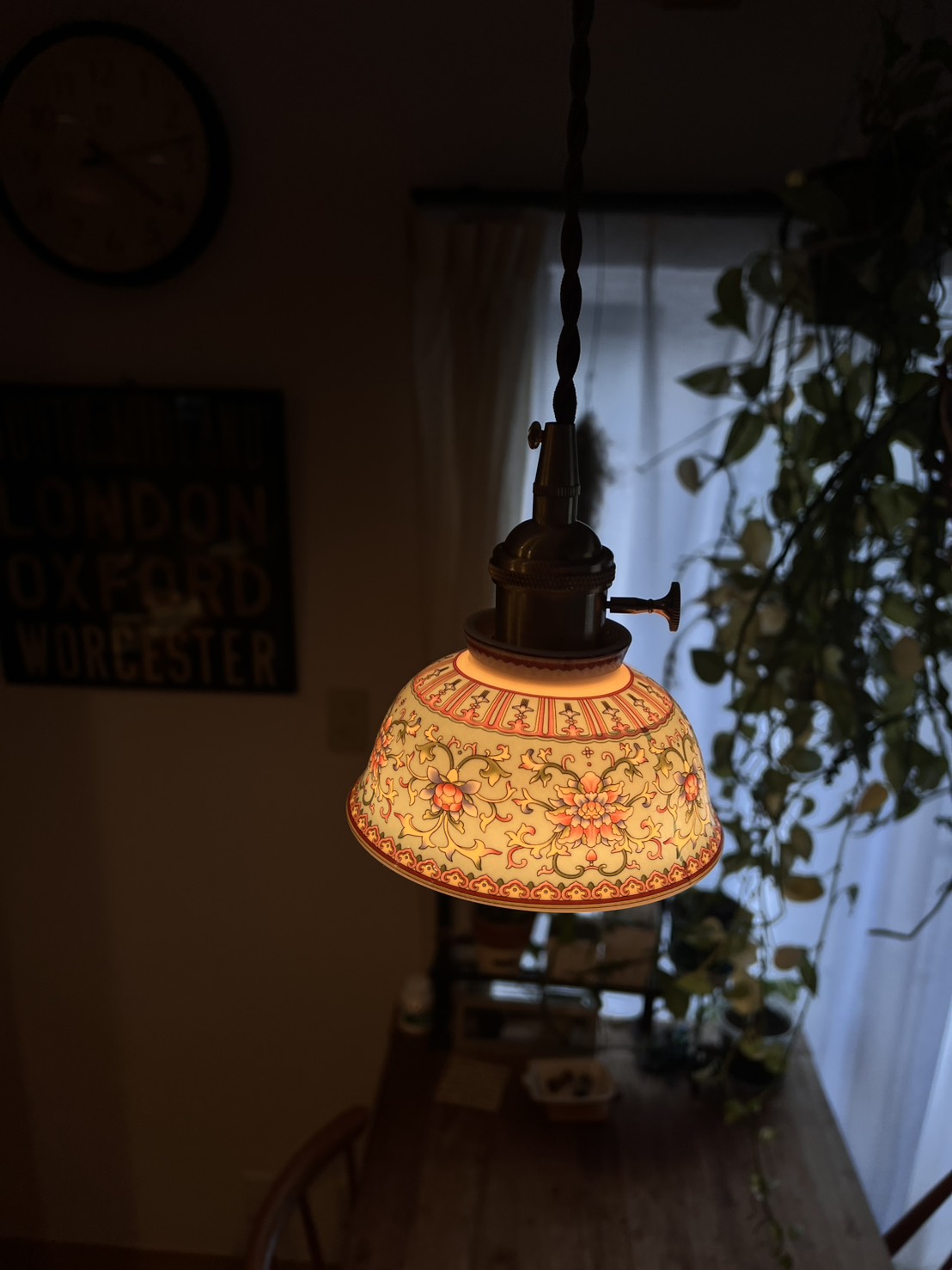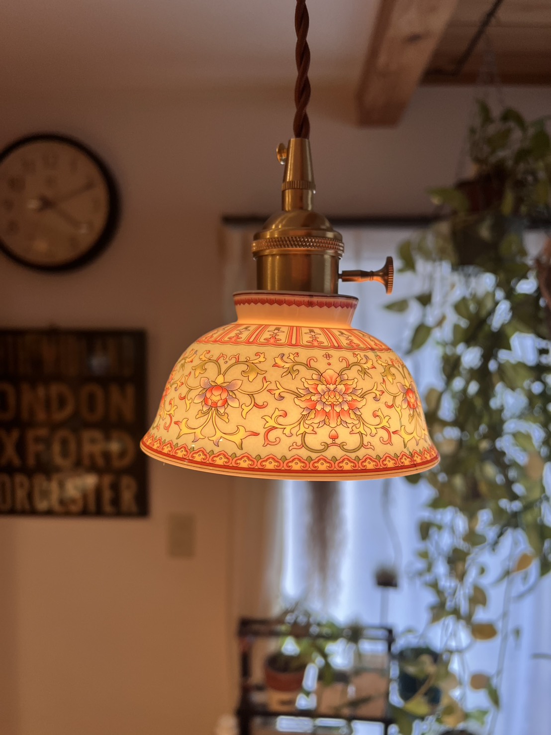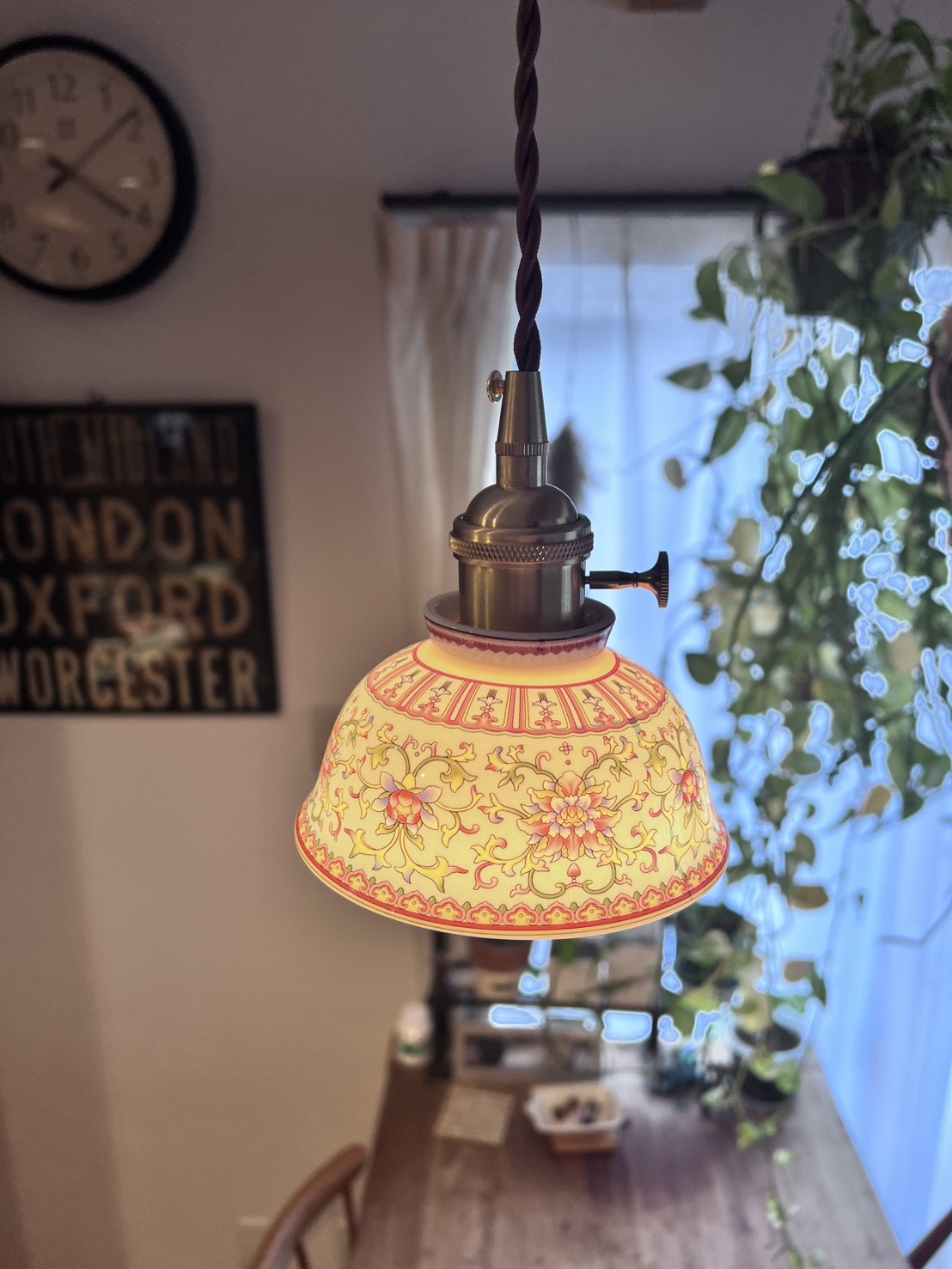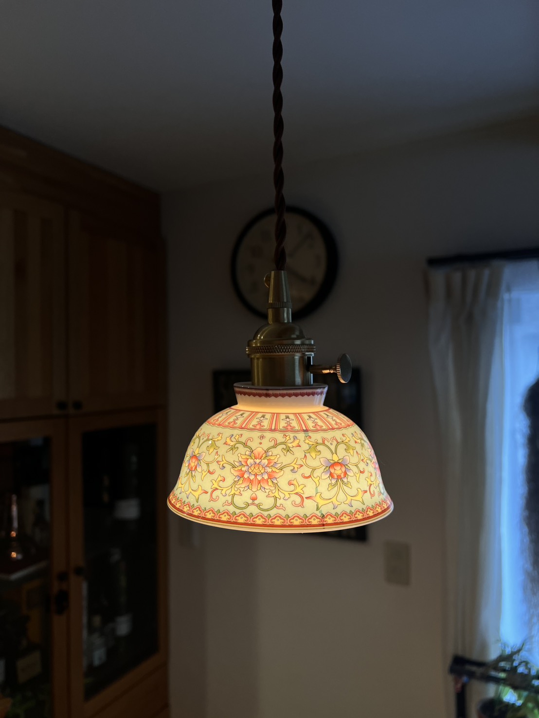 灯りをともすとシェード全体がまるで自ら発光しているかのように輝きます。赤や黄、ピンクの花模様が柔らかく浮かび上がり、陶器を透過した光が空間に温かく広がるその姿は、ガラス照明にはない奥行きと艶やかさを放ちます。千年の歴史を誇る景徳鎮の陶工が生み出した器に、日本の職人技が加わり完成したこの照明は、日常を芸術的な時間へと変える特別な一点物です。