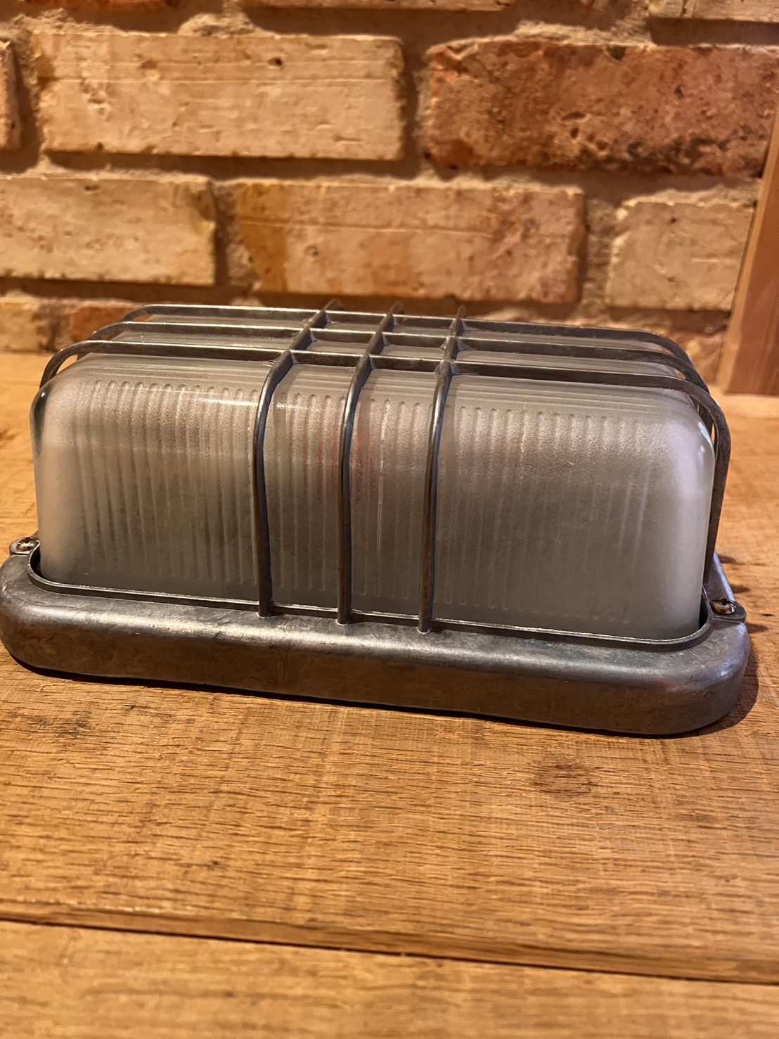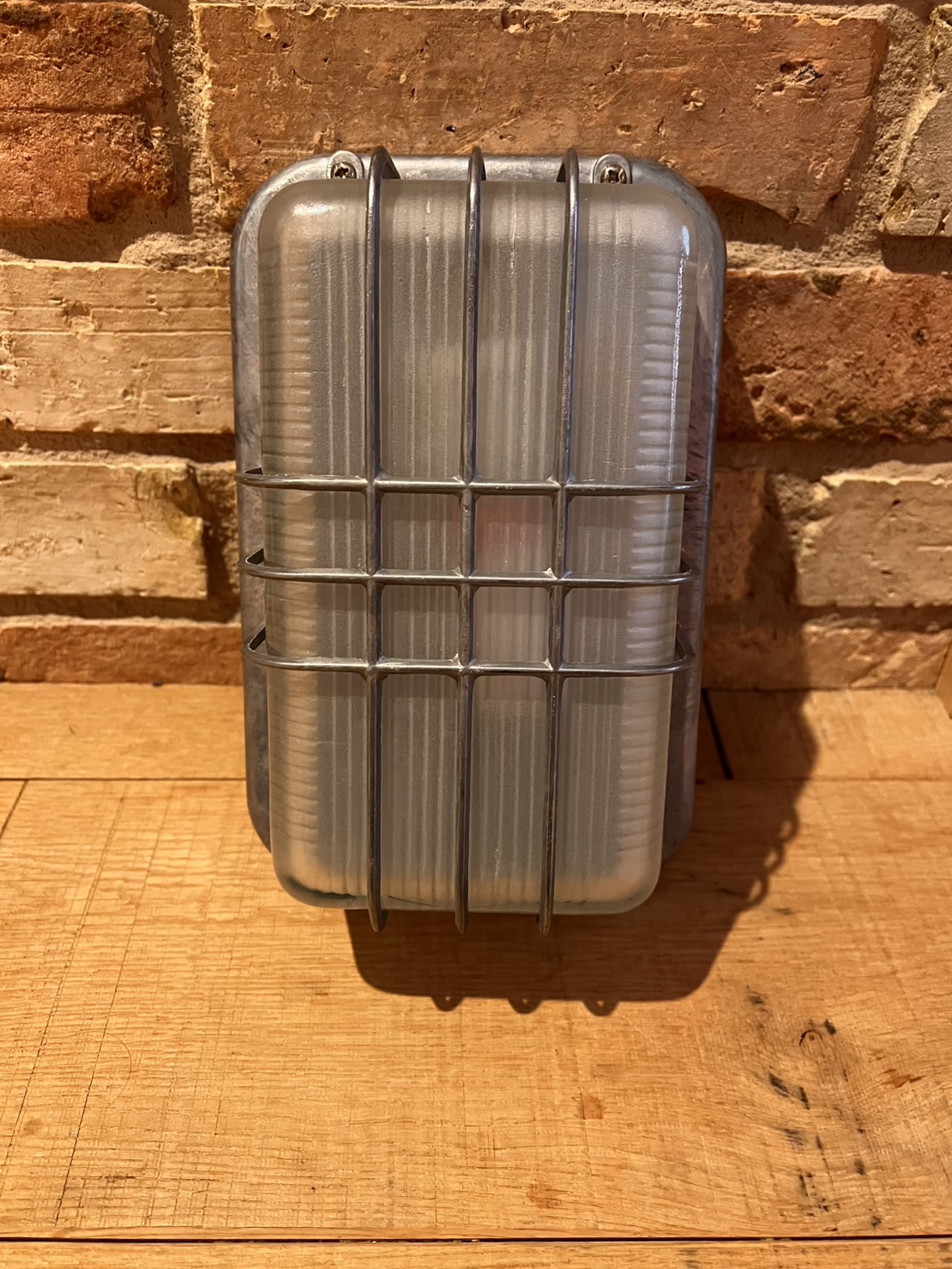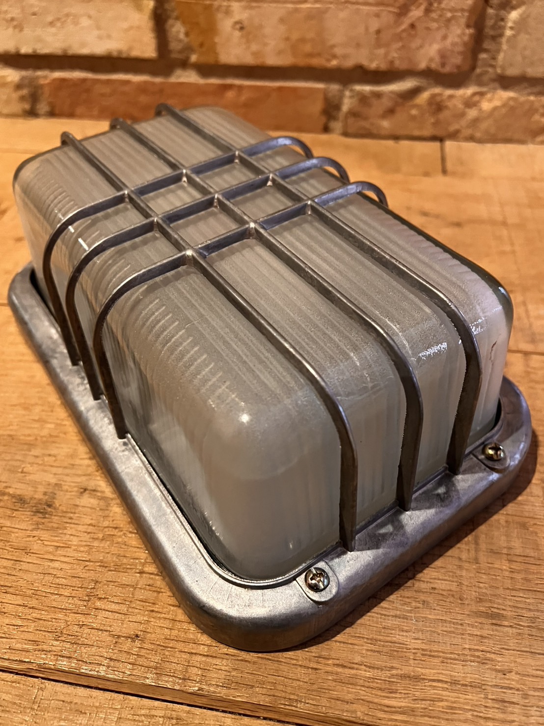 無骨で重厚なデザインが魅力のインダストリアル壁付け照明。アルミ素材とリブ入りガラスが醸し出すヴィンテージ感は、空間に個性と存在感を与えます。ガレージやカフェ、アンティーク調の演出にぴったりの一灯です。