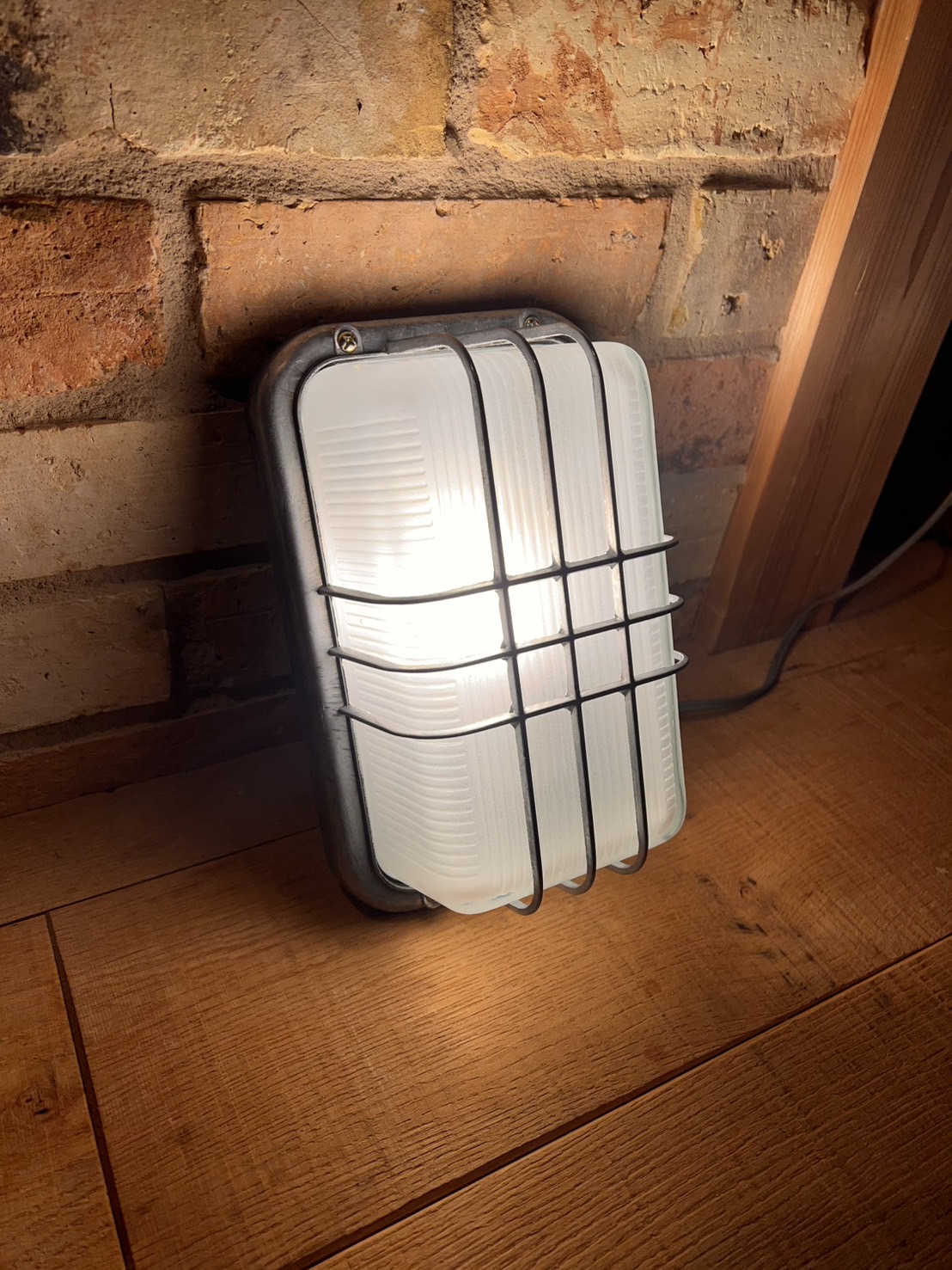 無骨で美しい鉄製の壁付け照明。レトロなデザインとガード付きの重厚感が、カフェやガレージ、玄関まわりにインダストリアルな雰囲気を演出します。